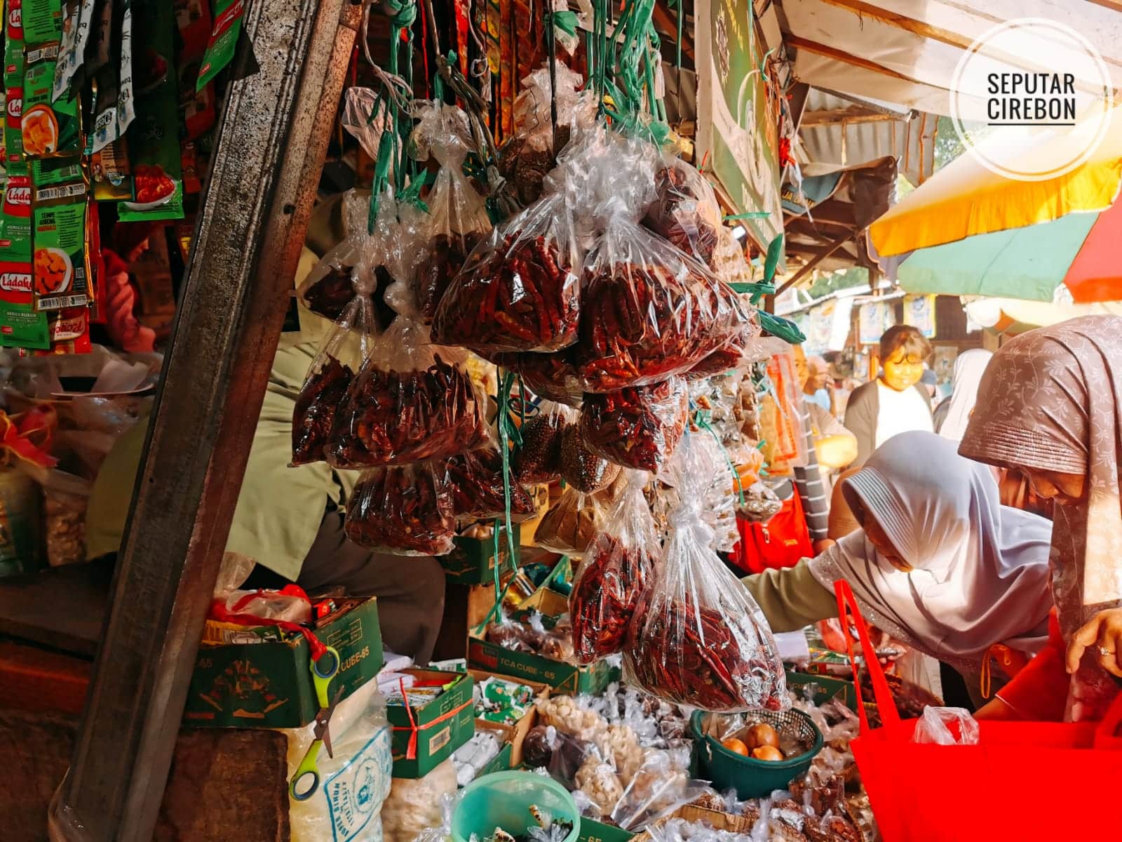 Di sebuah lorong pasar Cirebon, plastik-plastik bening berisi cabai kering bergoyang pelan tertiup angin. Warnanya merah tua, seperti bara yang tidak pernah benar-benar padam. Di bawahnya, bawang merah bertumpuk dalam keranjang hijau, kulitnya mengilap, menyimpan aroma tajam yang khas.